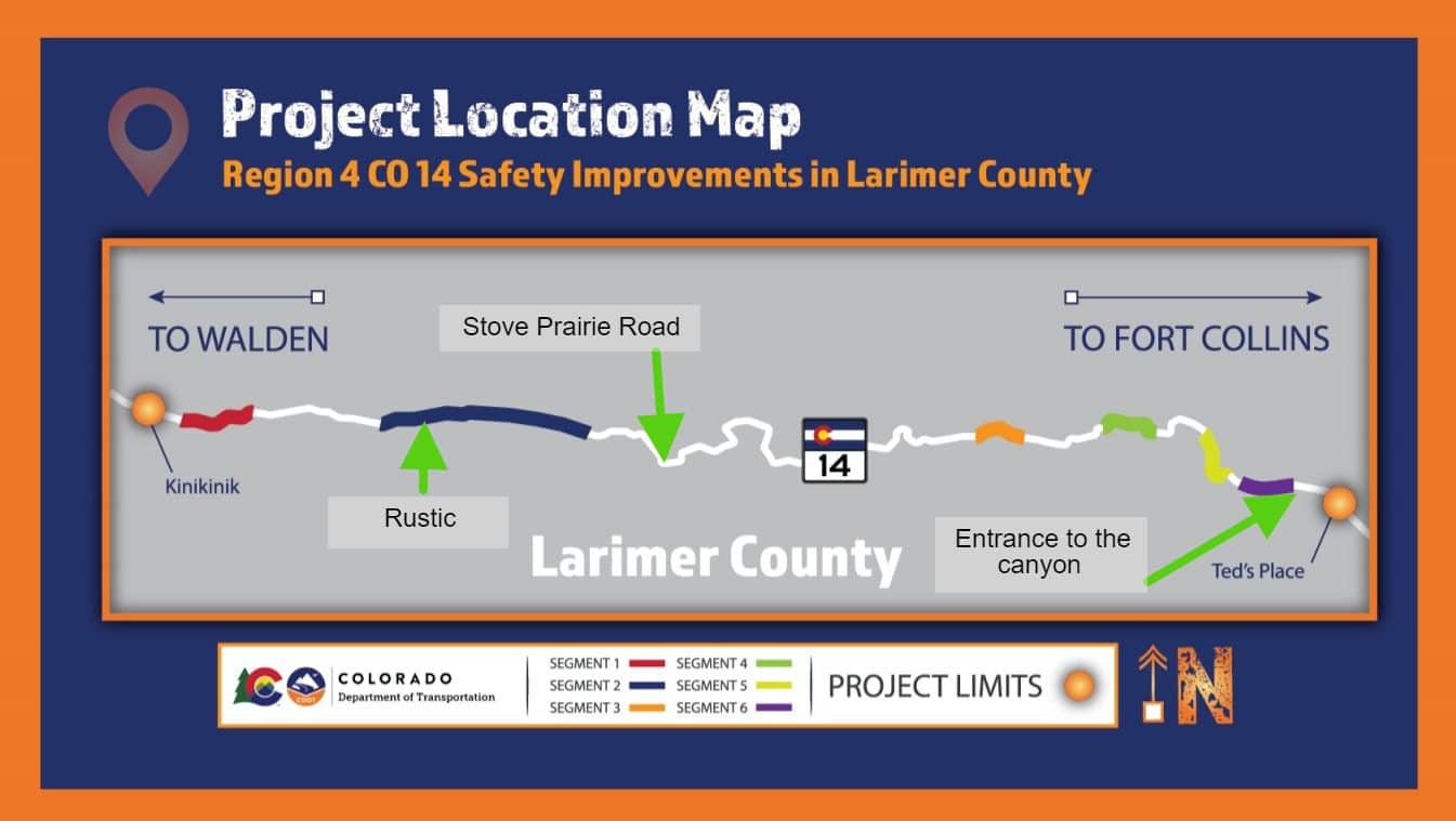 Image provided by CDOT. “Rustic”, “Stove Prairie Road”, and “entrance to the canyon” added by YGR for reference.