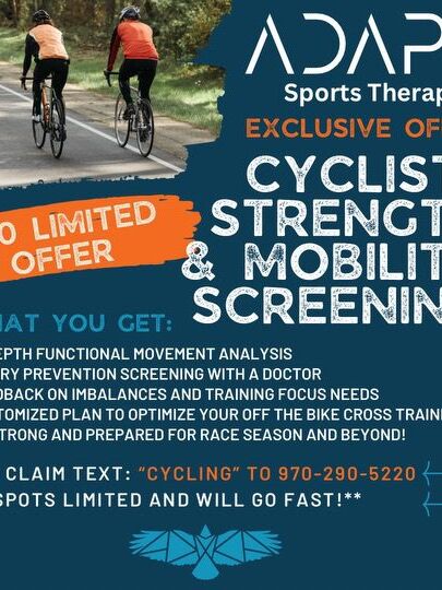 Adapt Sports Therapy is offering a Cyclist Strength & Mobility Screening this season. The thorough assessment of functional movement will identify and correct imbalances in cyclists, guiding them on off-bike activities to enhance strength and ensure a pain-free experience while on the bike. There are a limited number of $50.00 spots available.