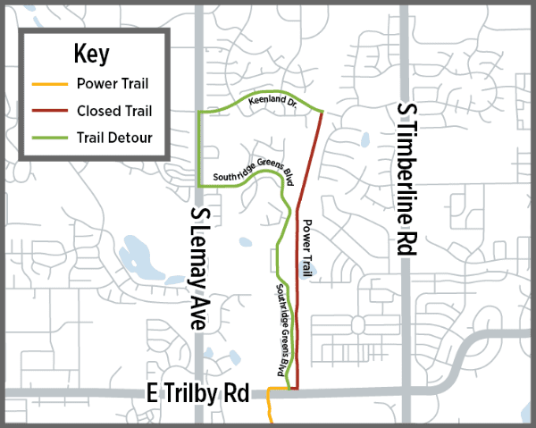 The Power Trail will be closed to all traffic between Keenland Drive and the intersection of East Trilby Road and Southridge Greens Boulevard beginning Friday, Feb. 28, due to the construction of the new Siphon Overpass – which will connect the Power Trail with the newly opened Mail Creek Trail in Summer 2025 via an overpass over the Union Pacific Railroad. The Power Trail will reopen when construction is complete in August 2025. Bicycle traffic using the Power Trail should use Keenland Drive, Lemay Avenue, and Southridge Greens Boulevard during the closure.